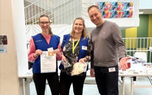 Lauttasaari-Seuran hallituksen puheenjohtaja Jyri Saraste (oik.) yhdessä seurakoordinaattori Elisa Julinin ja päiväkoti- ja koulutyöryhmän puheenjohtaja Sanna Rintalan (vas.) kanssa CircuLaru -kiertotaloustapahtumassa lokakuussa 2025.
