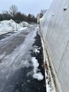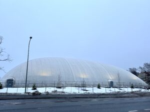 Kuplan käsittely on tarkkaa. Esimerkkinä vaikkapa tämä reuna. Tähän tarvitaan vanhempien lapiopartiota, joka lapioi lumen pois kuplan reunan päältä. Sen jälkeen aura auraa viereisen tien. Auralla kun ei voi mennä lähelle kuplaa, ettei se vaurioidu. Kuplan katolla olevaan lumenluontiin taas on oma siihen erikoistunut firmansa.