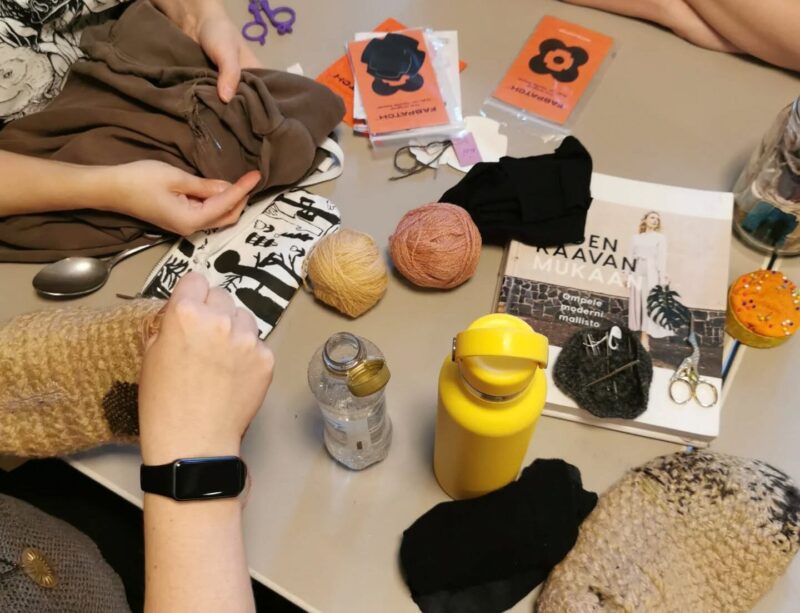 Meiltä löytyy perustarvikkeita korjausompeluun (myös ompelukone), joita saa lainata tapaamisten aikana. Voit myös ottaa mukaan omia tarvikkeita korjaamista varten. Apua ja opastusta saa halutessaan korjausaktiiveilta.