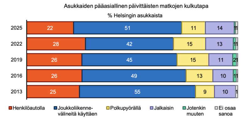 Osuuttaan vuodesta 2022 ovat kasvattaneet joukkoliikenne (52 %) ja kävely (14 %), jonka suosio ohitti ensimmäistä kertaa kymmeneen vuoteen pyöräilyn.