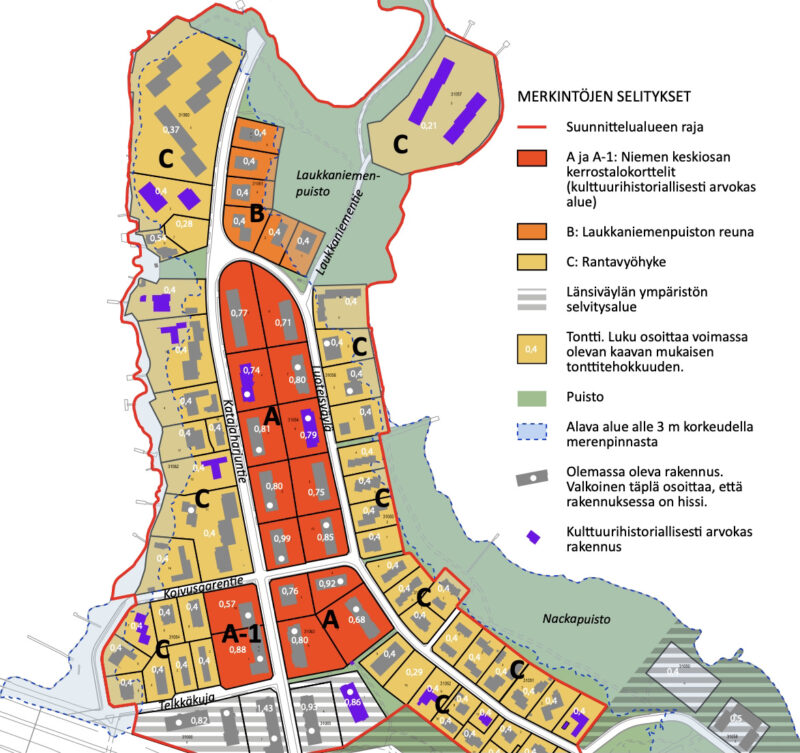 Suunnitteluperiaatteissa lisärakentaminen perustuu yleiskaavan mahdollistamaan tiivistämiseen, mutta ohjeiden mukaan etenkin ranta-alueilla rakentamisen määrää rajoitetaan. Alue on jaettu kolmeen vyöhykkeeseen. Keskellä kerrostaloalueella rakennuksia saisi korottaa yhdellä kerroksella. Laukkaniemenpuiston reunalla talot voisivat olla viisikerroksia. Näillä alueilla saisi rakentaa pihoille esimerkiksi grillikatoksia. Ranta-alueilla rakennukset saisivat olla 3-kerroksisia.