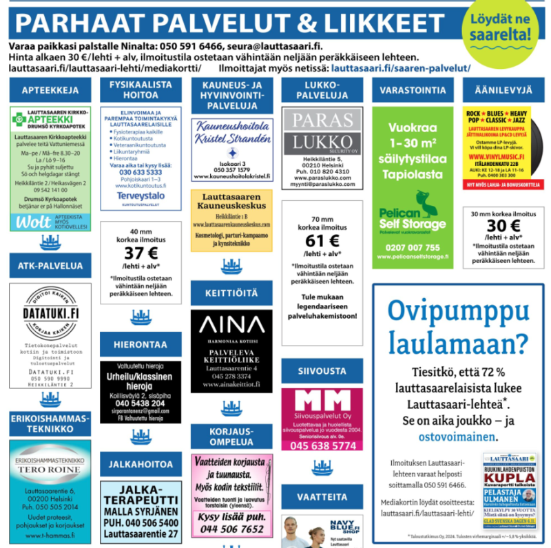 Monipuoliset lauttasaarelaiset palvelut näyttäytyvät joka viikko Lauttasaari-lehdessä.