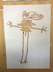 Hän kertoo lasten piirtäneen niitä leikkejä, joita he rannoilla leikkivät. On merenneitoja, eläimiä, perhettä, kasveja, seikkailuja, ukkosmyrskyä. Jokaisesta piirrustuksesta on tehty seinään heijastamalla mahdollisimman tarkka sabluuna kartongille. Niistä aikuisten taidepajalaiset ovat veitsellä avanneet aukot värittämistä varten. Sabluunoita on tehty myös aakkosista. Niitä käytetään maalaamaan senioreiden tarinoiden ydinajatuksia ja keskeisiä viestejä. Punainen lanka niissä on toive, että rannat säilysivät mahdollisimman koskemattomina ja vapaina tuleville sukupolville. Sama toive näkyy myös lasten piirrustuksissa.