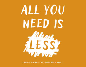 “All you need is less” on Suomen Emmaus-ryhmien kampanja vaatteiden ylikulutusta ja ylituotantoa vastaan. Lue lisää tästä.