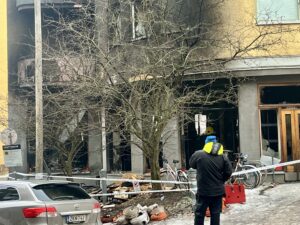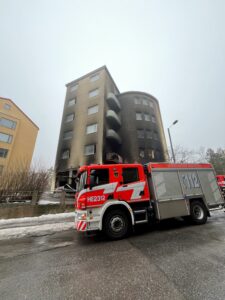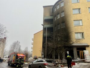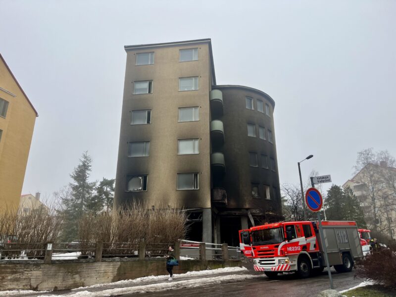 Pajalahdentie 9:n julkisivu kärsi myös vaurioita. Pelastuslaitoksen yksikköjä oli paikalla vielä aamukahdeksalta. Teosta epäiltynä otettiin myöhemmin kiinni kaksi nuorta miestä. Kuva: Pete Suhonen